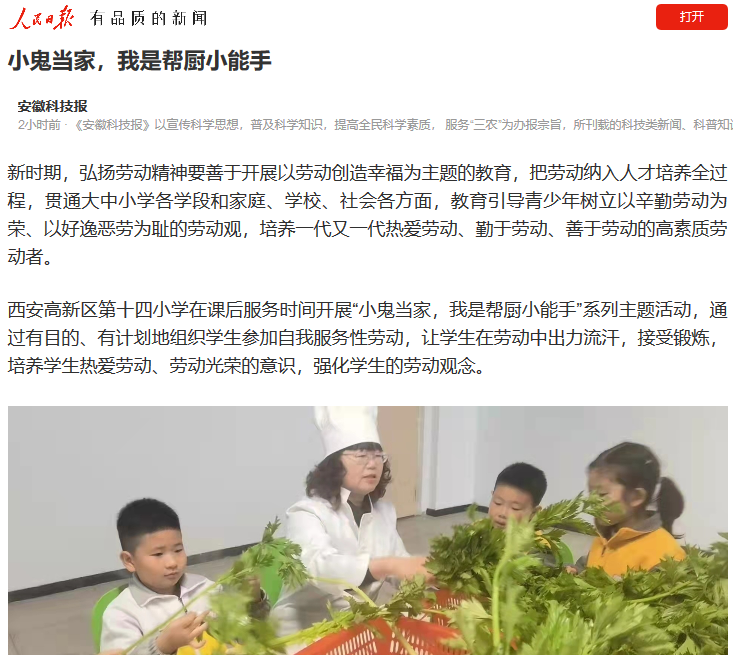 西安高新区第十四小学在课后服务时间开展“小鬼当家,我是帮厨小能手”系列主题活动,通过有目的、有计划地组织学生参加自我服务性劳动,让学生在劳动中出力流汗,接受锻炼,培养学生热爱劳动、劳动光荣的意识,强化学生的劳动观念。